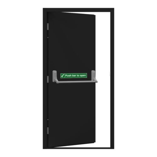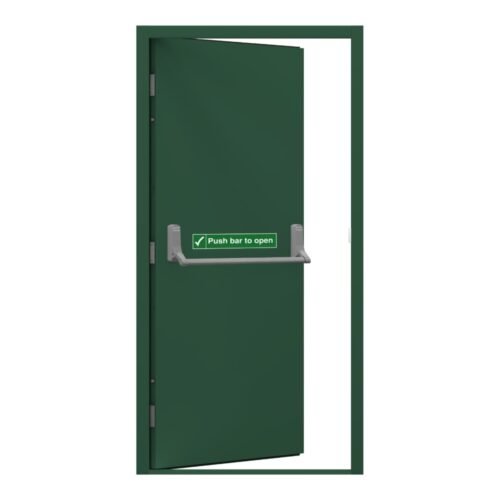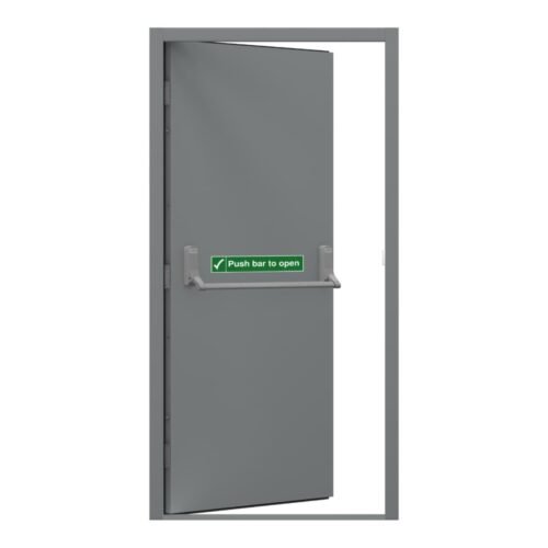 It comes fitted with an Exidor 296 fire escape door push bar. Fully galvanised, pre-assembled door & frame with fitted Exidor single point panic hardware.